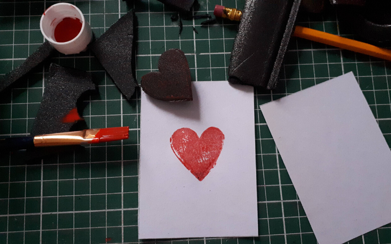 Il suffit de couper un morceau dans la partie plate d’un emballage de fruits ou légumes. Puis dessiner et creuser le dessin avec la pointe d’un crayon de bois ou un objet un peu pointu. On colle quelques morceaux de mousse à l’arrière pour pouvoir tenir notre étampe et il ne reste plus qu’à mettre les couleurs! Avec un pinceau, on applique une fine couche de peinture (ou plusieurs couleurs) sur l’étampe et il suffit d’appuyer fort sur la carte pour imprimer le dessin. On peut aussi graver du texte sous le dessin mais attention, il faut écrire à l’envers 😉