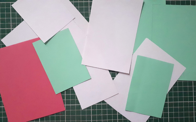 - Couper des rectangles dans le papier. J’aime faire un format carte postale 10cm x 15 cm. En coupant mes cartes, il me restait des petits formats 10×7 qui sont aussi parfaits. Mais finalement, on peut faire un peu le format que l’on veut!